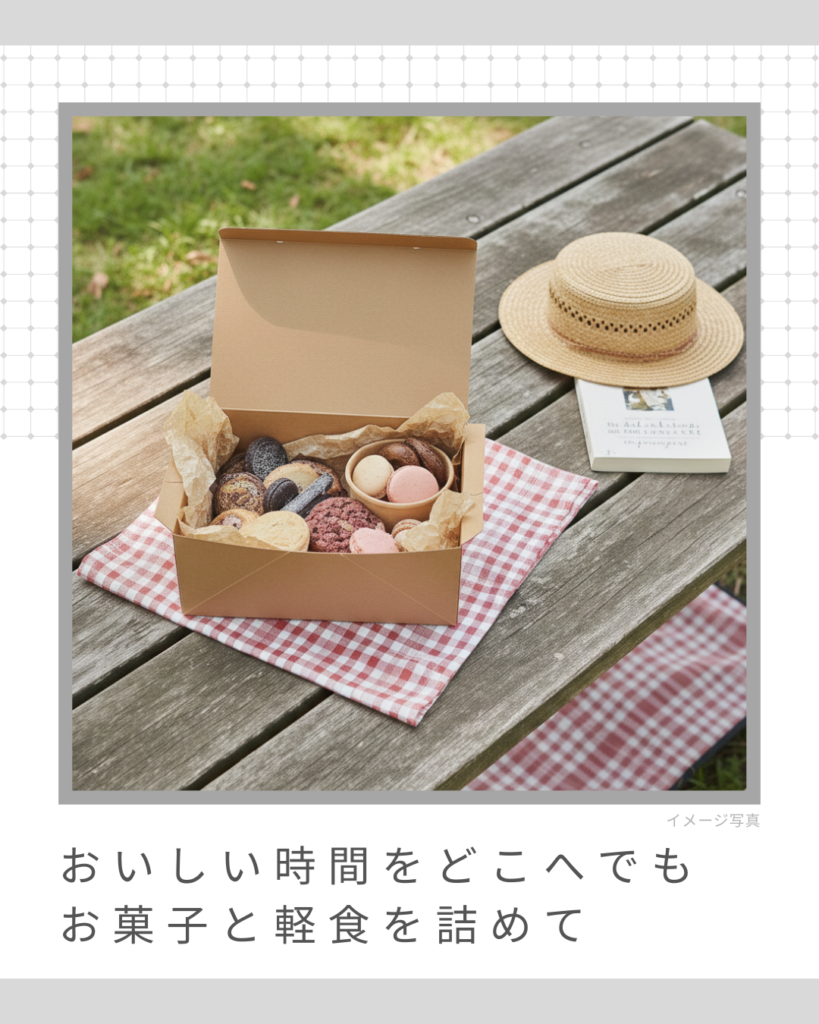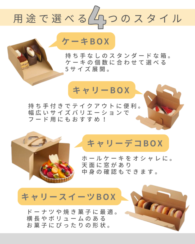 「ケーキBOX」は、小型のフードカップや耐油シートを敷いて、ランチボックスとして使うのも店長イチ押しの活用術です!
