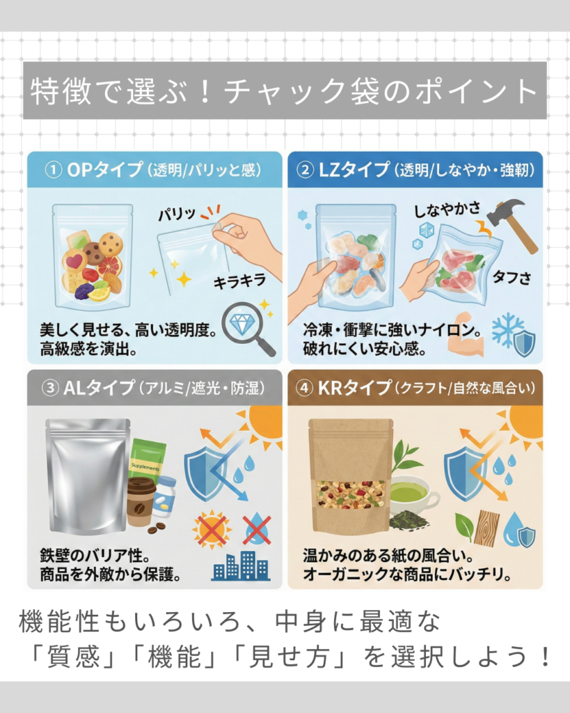 今回は、お店のスタイルに合わせて選べるチャック袋4種を徹底比較しました。
