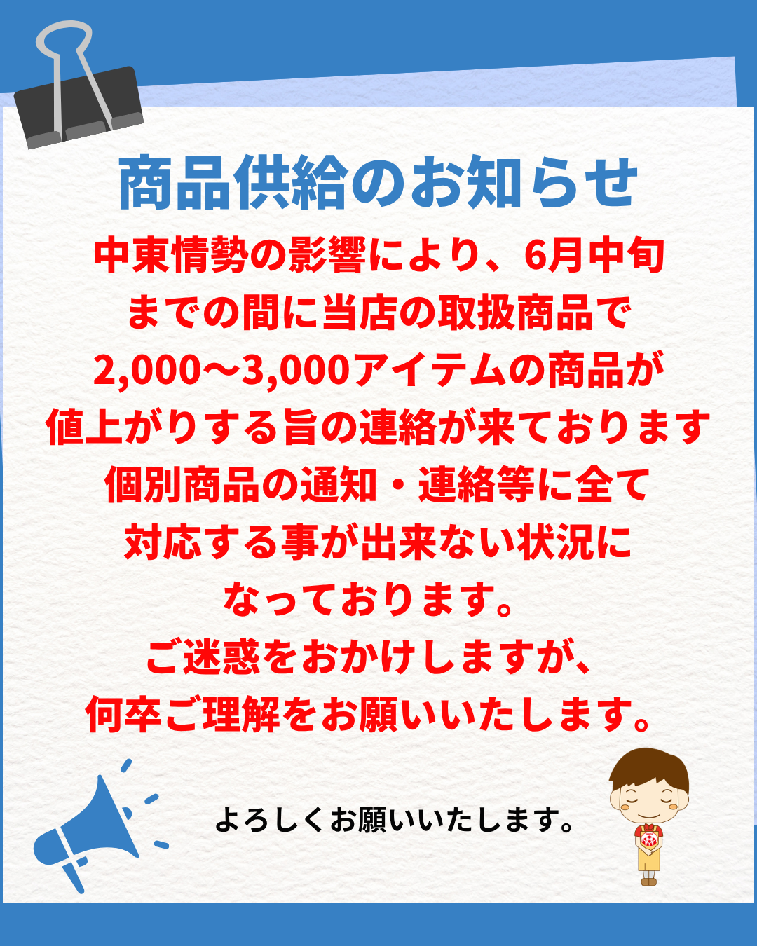 中東情勢の影響により、6月中旬までの間に当店の取扱商品で2,000~3,000アイテムの商品が値上がりする旨の連絡が来ております