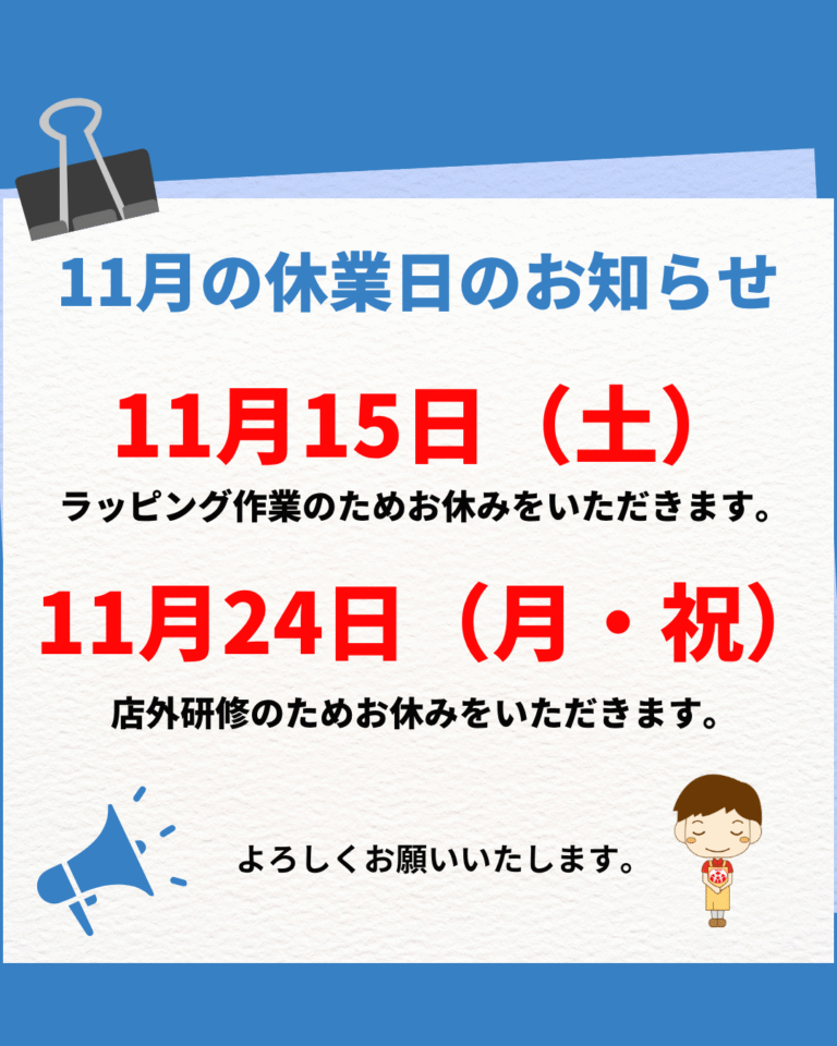11/15(土) ラッピング作業のためお休みさせていただきます。 11/24(月・祝) 店外研修のためお休みさせていただきます。 ご来店を予定のお客様にはご迷惑 […]