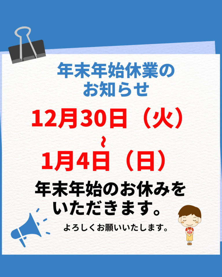 お正月期間のお休みのご連絡です 12月29日(月) ➡ 営 業 12月30日(火) ➡ お休み 12月31日(水) ➡ お休み 1月1日(木) ➡ お休み 1月 […]
